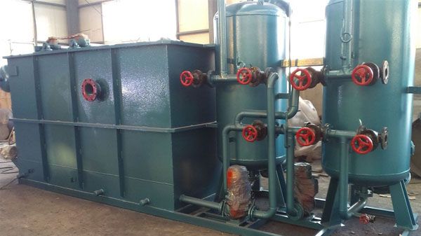 深度處理階段調(diào)節(jié)池的水經(jīng)泵提升至氣浮機,先期去除水中懸浮物(ss),去除率達90%以上,出水進入JHYD設備,JHYD設備由(水解酸化池、二級接觸氧化池、沉淀池、消毒池組成),污水在水解酸化池進行酸化處理,通過厭氧菌將大分子有機物轉(zhuǎn)化成低分子有機物;經(jīng)水解酸化池流入接觸氧化池進行生化反應后再進入沉淀池,出水經(jīng)過濾消毒達標排放。